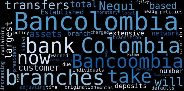 The game is changing. There is a new strategy to evaluate Bancolombia fundamental value, possible risks and most salient advantages. Investors have traditionally relied in reading large amounts of text to evaluate the fundamental value of a stock or company. However, the development of Artificial Intelligence (AI) tools is modifying the way investments are evaluated in markets. Today, machine learning, natural language processing and bigdata allow making this process automatic, reducing large amounts of text to the elements that have a higher activation in a neural network. We programmed an artificial intelligence that reads the whole internet and the uses natural language processing and vectorizers to summarize the information. Usually, the AI reads several hundred pages and summarize it to a short document. This document presents our results. We found that the most common words in the internet about Bancolombia are: Bancolombia, branch, bank, Colombia, policy, take, Bancoombia, and the …