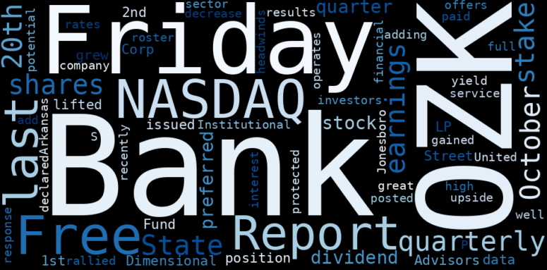 Are looking for the most relevant information about Bank OZK? Investor spend a lot of time searching for information to make investment decisions in Bank OZK. This task is often burdensome and consumes huge amounts of free time. It also leads to mistakes due to fatigue and bounded rationality. As a solution, we programmed an artificial intelligence that reads the whole internet and the uses natural language processing and vectorizers to summarize the information. Usually, the AI reads several hundred pages and summarize it to a short document. This document presents our results. We found that the most common words in the internet about Bank OZK are: Bank, OZK, Friday, bank, NASDAQOZK, Get, Free, and the most common words in the summary are: bank, best, account, stock, job, credit, business, . One of the sentences in the summary was: Institutional investors add their stakes.. Other searches related to this term …