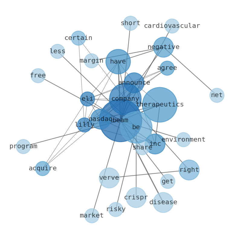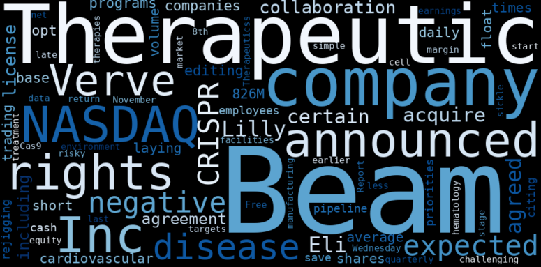 The game is changing. There is a new strategy to evaluate Beam Therapeutics fundamental value, possible risks and most salient advantages. Investors have traditionally relied in reading large amounts of text to evaluate the fundamental value of a stock or company. However, the development of Artificial Intelligence (AI) tools is modifying the way investments are evaluated in markets. Today, machine learning, natural language processing and bigdata allow making this process automatic, reducing large amounts of text to the elements that have a higher activation in a neural network. We programmed an artificial intelligence that reads the whole internet and the uses natural language processing and vectorizers to summarize the information. Usually, the AI reads several hundred pages and summarize it to a short document. This document presents our results. We found that the most common words in the internet about Beam Therapeutics are: Beam, Therapeutics, company, Inc, NASDAQBEAM, announce, right, …