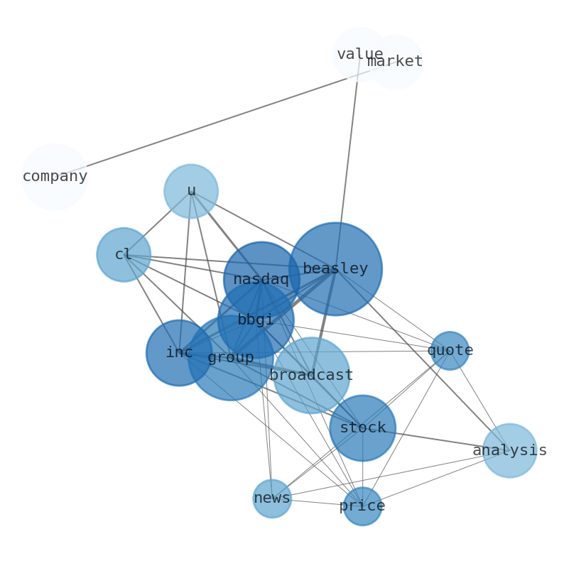 How much time have you spent trying to decide whether investing in Beasley Broadcast Group? Many investors start with the dream of being free. They expect to find on the stock market an option to have time to develop their own interests and hobbies. That is, a way to escape a 9 to 5 job. However, investment is complex and investors end up spending whole days (and nights) trying to figure out which the right stock to invest is. The dream of stock investing becomes the nightmare of facing infinity amounts of information. As a solution, we programmed an artificial intelligence that reads the whole internet and the uses natural language processing and vectorizers to summarize the information. Usually, the AI reads several hundred pages and summarize it to a short document. This document presents our results. We found that the most common words in the internet about Beasley Broadcast Group are: Beasley, Group, Broadcast, stock, company, NASDAQBBGI, analysis, and the most common words in the summary are: beasley, broadcast, group, stock, market, medium, best, . One of the sentences in the summary was: The market capitalization of a company is the value of a publicly listed company.. Other searches related to this term that the AI found were: stockmarketlive, livestock, stockmarketforbeginners, thestockmarket, stockmarkettoday, stockmarkettrading, stockmarketstocks, todaystockmarket, thestockmarket, marketnews, stockmarketnews, whatisstockmarket, usstockmarket, stockmarketopen. #beasley #broadcast #group #stock #market #medium #best.