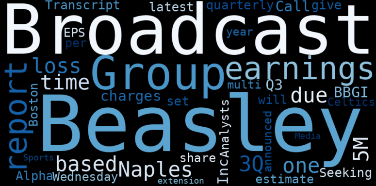This document will help you to evaluate Beasley Broadcast Group without reading an infinite amount of sources. Relying only on stock quotes or prices to make investment decisions is a mistake. Analyzing and observing stock charts, highs and lows and other numerical data does not allow to evaluate the real value of a company. Stock quotes and prices are the result of underlying characteristics of a company and of events and news happening around them. For this reason, investing must be based on information, not numbers. As a solution, we programmed an artificial intelligence that reads the whole internet and the uses natural language processing and vectorizers to summarize the information. Usually, the AI reads several hundred pages and summarize it to a short document. This document presents our results. We found that the most common words in the internet about Beasley Broadcast Group are: Beasley, report, Group, Broadcast, earnings, broadcast, Naplesbased, and the most common words in the summary are: beasley, group, radio, medium, broadcast, revenue, news, . One of the sentences in the summary was: Naples-based Beasley reports $67.5M 3Q loss, due to one-time charges. Other searches related to this term that the AI found were: stockmarketlive, livestock, stockmarketforbeginners, thestockmarket, stockmarkettoday, stockmarkettrading, stockmarketstocks, todaystockmarket, thestockmarket, marketnews, stockmarketnews, whatisstockmarket, usstockmarket, stockmarketopen. #beasley #group #radio #medium #broadcast #revenue #news.
