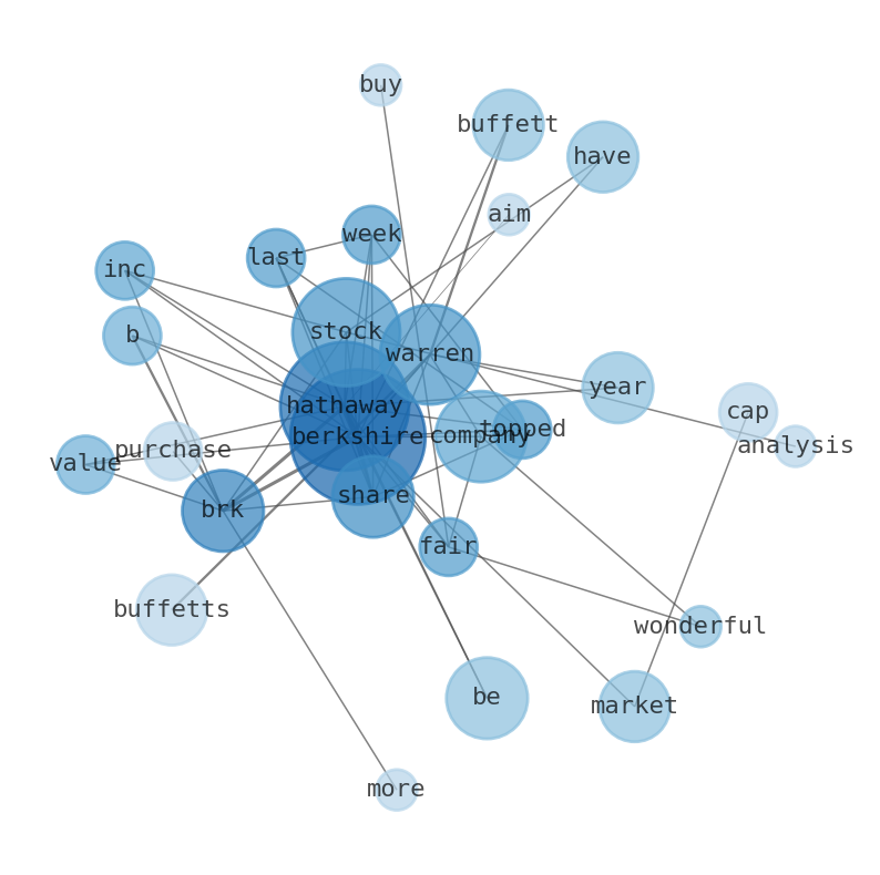 Are looking for the most relevant information about Berkshire Hathaway? Investor spend a lot of time searching for information to make investment decisions in Berkshire Hathaway. This task is often burdensome and consumes huge amounts of free time. It also leads to mistakes due to fatigue and bounded rationality. As a solution, we programmed an artificial intelligence that reads the whole internet and the uses natural language processing and vectorizers to summarize the information. Usually, the AI reads several hundred pages and summarize it to a short document. This document presents our results. We found that the most common words in the internet about Berkshire Hathaway are: Berkshire, Hathaway, Warren, company, stock, share, Buffett, and the most common words in the summary are: berkshire, hathaway, stock, best, market, credit, warren, . One of the sentences in the summary was: 64% of Warren Buffetts $371 Billion Portfolio Is Invested in just 3 stocks.. Other searches related to this term that the AI found were: stockmarketlive, livestock, stockmarketforbeginners, thestockmarket, stockmarkettoday, stockmarkettrading, stockmarketstocks, todaystockmarket, thestockmarket, marketnews, stockmarketnews, whatisstockmarket, usstockmarket, stockmarketopen. #berkshire #hathaway #stock #best #market #credit #warren.