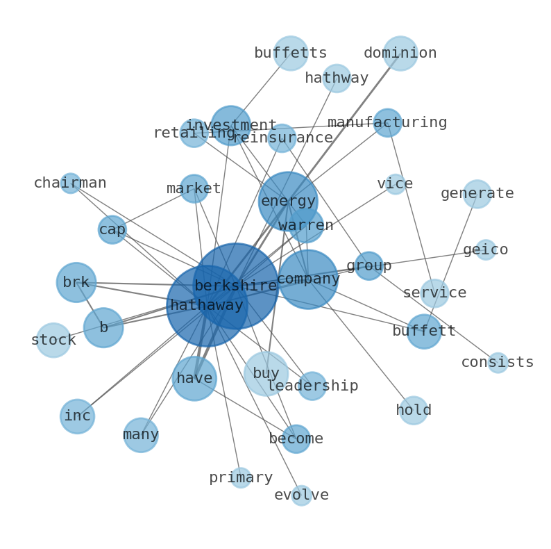 The game is changing. There is a new strategy to evaluate Berkshire Hathaway fundamental value, possible risks and most salient advantages. Investors have traditionally relied in reading large amounts of text to evaluate the fundamental value of a stock or company. However, the development of Artificial Intelligence (AI) tools is modifying the way investments are evaluated in markets. Today, machine learning, natural language processing and bigdata allow making this process automatic, reducing large amounts of text to the elements that have a higher activation in a neural network. We programmed an artificial intelligence that reads the whole internet and the uses natural language processing and vectorizers to summarize the information. Usually, the AI reads several hundred pages and summarize it to a short document. This document presents our results. We found that the most common words in the internet about Berkshire Hathaway are: Berkshire, Hathaway, company, Energy, stake, buy, Hathaways, …