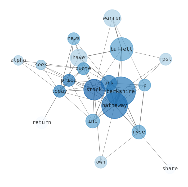 Are looking for the most relevant information about Berkshire Hathaway? Investor spend a lot of time searching for information to make investment decisions in Berkshire Hathaway. This task is often burdensome and consumes huge amounts of free time. It also leads to mistakes due to fatigue and bounded rationality. As a solution, we programmed an artificial intelligence that reads the whole internet and the uses natural language processing and vectorizers to summarize the information. Usually, the AI reads several hundred pages and summarize it to a short document. This document presents our results. We found that the most common words in the internet about Berkshire Hathaway are: Berkshire, Hathaway, Buffett, stock, Warren, Inc, company, and the most common words in the summary are: berkshire, hathaway, stock, market, buffett, warren, portfolio, . One of the sentences in the summary was: As of June 30th, 2021, Berkshire Hathaways holdings were valued at …