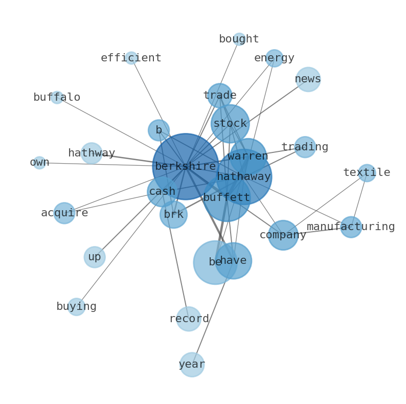 This document will help you to evaluate Berkshire Hathaway without reading an infinite amount of sources. Relying only on stock quotes or prices to make investment decisions is a mistake. Analyzing and observing stock charts, highs and lows and other numerical data does not allow to evaluate the real value of a company. Stock quotes and prices are the result of underlying characteristics of a company and of events and news happening around them. For this reason, investing must be based on information, not numbers. As a solution, we programmed an artificial intelligence that reads the whole internet and the uses natural language processing and vectorizers to summarize the information. Usually, the AI reads several hundred pages and summarize it to a short document. This document presents our results. We found that the most common words in the internet about Berkshire Hathaway are: Berkshire, Hathaway, Buffett, Warren, stock, Hathaways, trade, …