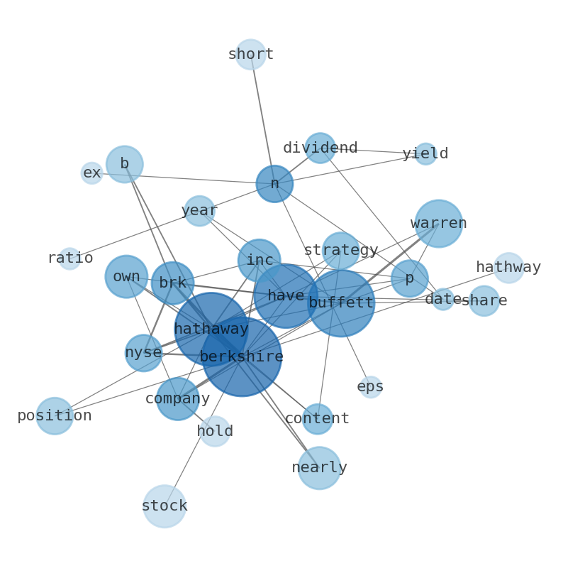 This document will help you to evaluate Berkshire Hathaway without reading an infinite amount of sources. Relying only on stock quotes or prices to make investment decisions is a mistake. Analyzing and observing stock charts, highs and lows and other numerical data does not allow to evaluate the real value of a company. Stock quotes and prices are the result of underlying characteristics of a company and of events and news happening around them. For this reason, investing must be based on information, not numbers. As a solution, we programmed an artificial intelligence that reads the whole internet and the uses natural language processing and vectorizers to summarize the information. Usually, the AI reads several hundred pages and summarize it to a short document. This document presents our results. We found that the most common words in the internet about Berkshire Hathaway are: Berkshire, Buffett, Hathaway, Warren, own, company, stock, …