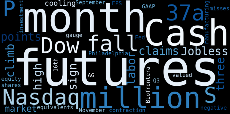S&P 500 futures off 0.1%; Nasdaq-100 futures fall 0.2% 8:37a Dow futures down 48 points, or 0.10%. Jobless claims climb to three-month high of 231,000 in sign labor market is cooling. Philadelphia Fed manufacturing gauge negative in November for 16th month of contraction. Q3 GAAP EPS of -$4.64 misses by $0.85. Cash and cash equivalents were $3.4 million and equity investment in shares of Biofrontera AG was valued $3.3 million, both as of September 30, 2023.