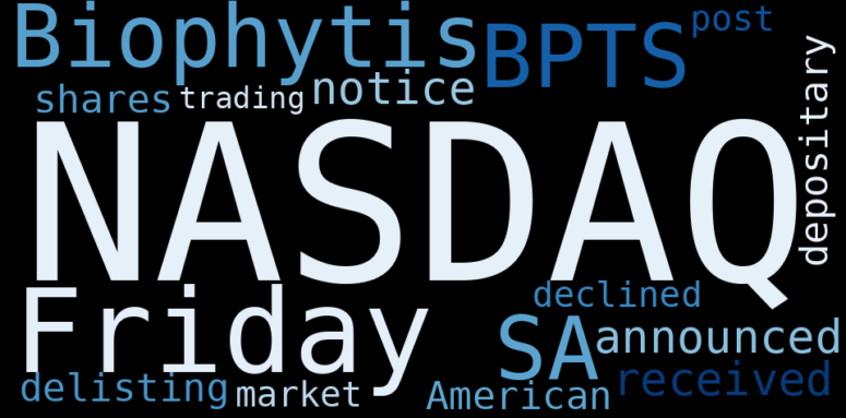The game is changing. There is a new strategy to evaluate Biophytis fundamental value, possible risks and most salient advantages. Investors have traditionally relied in reading large amounts of text to evaluate the fundamental value of a stock or company. However, the development of Artificial Intelligence (AI) tools is modifying the way investments are evaluated in markets. Today, machine learning, natural language processing and bigdata allow making this process automatic, reducing large amounts of text to the elements that have a higher activation in a neural network. We programmed an artificial intelligence that reads the whole internet and the uses natural language processing and vectorizers to summarize the information. Usually, the AI reads several hundred pages and summarize it to a short document. This document presents our results. We found that the most common words in the internet about Biophytis are: Friday, Biophytis, SA, NASDAQ, BPTS, announce, received, and the most common words in the summary are: follow, nasdaq, inc, univ, pharmaceutical, therapeutic, ltd, . One of the sentences in the summary was: Biophytis SA (NASDAQ: BPTS) on Friday announced that it has received a notice of delisting from Nasdaq. Other searches related to this term that the AI found were: stockmarketlive, livestock, stockmarketforbeginners, thestockmarket, stockmarkettoday, stockmarkettrading, stockmarketstocks, todaystockmarket, thestockmarket, marketnews, stockmarketnews, whatisstockmarket, usstockmarket, stockmarketopen. #follow #nasdaq #inc #univ #pharmaceutical #therapeutic #ltd.