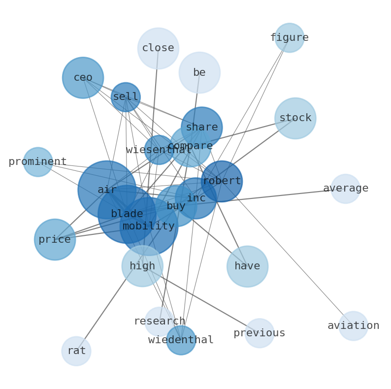 This document will help you to evaluate Blade Air Mobility without reading an infinite amount of sources. Relying only on stock quotes or prices to make investment decisions is a mistake. Analyzing and observing stock charts, highs and lows and other numerical data does not allow to evaluate the real value of a company. Stock quotes and prices are the result of underlying characteristics of a company and of events and news happening around them. For this reason, investing must be based on information, not numbers. As a solution, we programmed an artificial intelligence that reads the whole internet and the uses natural language processing and vectorizers to summarize the information. Usually, the AI reads several hundred pages and summarize it to a short document. This document presents our results. We found that the most common words in the internet about Blade Air Mobility are: Blade, Air, Mobility, CEO, Robert, …