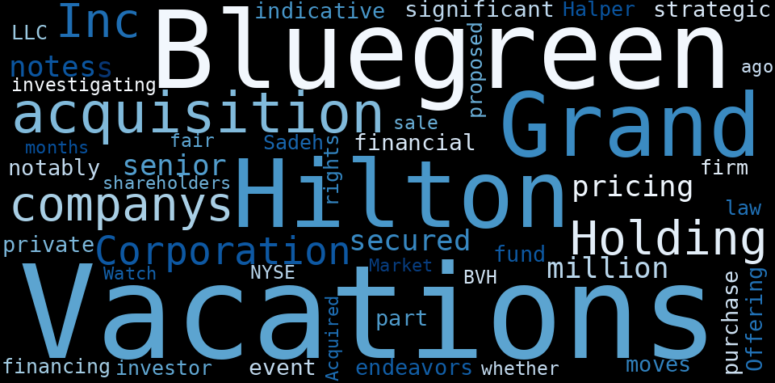 Are looking for the most relevant information about Bluegreen Vacations Holding? Investor spend a lot of time searching for information to make investment decisions in Bluegreen Vacations Holding. This task is often burdensome and consumes huge amounts of free time. It also leads to mistakes due to fatigue and bounded rationality. As a solution, we programmed an artificial intelligence that reads the whole internet and the uses natural language processing and vectorizers to summarize the information. Usually, the AI reads several hundred pages and summarize it to a short document. This document presents our results. We found that the most common words in the internet about Bluegreen Vacations Holding are: Vacations, Hilton, Grand, acquisition, Bluegreen, Holding, Corporation, and the most common words in the summary are: vacation, bluegreen, job, hilton, grand, stock, hold, . One of the sentences in the summary was: 2 months ago - Market Watch Bluegreen Vacations to be Acquired by Hilton Grand.. Other searches related to this term that the AI found were: stockmarketlive, livestock, stockmarketforbeginners, thestockmarket, stockmarkettoday, stockmarkettrading, stockmarketstocks, todaystockmarket, thestockmarket, marketnews, stockmarketnews, whatisstockmarket, usstockmarket, stockmarketopen. #vacation #bluegreen #job #hilton #grand #stock #hold.