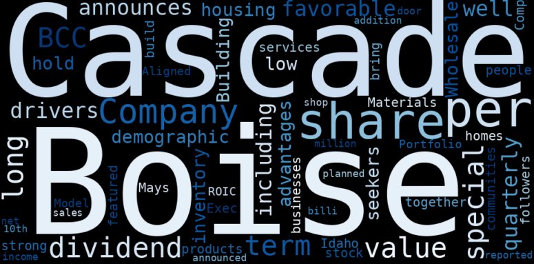 The game is changing. There is a new strategy to evaluate Boise Cascade Company fundamental value, possible risks and most salient advantages. Investors have traditionally relied in reading large amounts of text to evaluate the fundamental value of a stock or company. However, the development of Artificial Intelligence (AI) tools is modifying the way investments are evaluated in markets. Today, machine learning, natural language processing and bigdata allow making this process automatic, reducing large amounts of text to the elements that have a higher activation in a neural network. We programmed an artificial intelligence that reads the whole internet and the uses natural language processing and vectorizers to summarize the information. Usually, the AI reads several hundred pages and summarize it to a short document. This document presents our results. We found that the most common words in the internet about Boise Cascade Company are: Boise, Cascade, share, Company, special, dividend, value, and the most common words in the summary are: boise, cascade, company, job, stock, share, market, . One of the sentences in the summary was: Boise Cascade announces quarterly and special dividends of $0.20 per share, as well as a special dividend of $5.00 per share. Other searches related to this term that the AI found were: stockmarketlive, livestock, stockmarketforbeginners, thestockmarket, stockmarkettoday, stockmarkettrading, stockmarketstocks, todaystockmarket, thestockmarket, marketnews, stockmarketnews, whatisstockmarket, usstockmarket, stockmarketopen. #boise #cascade #company #job #stock #share #market.