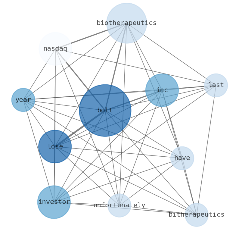 This document will help you to evaluate Bolt Biotherapeutics without reading an infinite amount of sources. Relying only on stock quotes or prices to make investment decisions is a mistake. Analyzing and observing stock charts, highs and lows and other numerical data does not allow to evaluate the real value of a company. Stock quotes and prices are the result of underlying characteristics of a company and of events and news happening around them. For this reason, investing must be based on information, not numbers. As a solution, we programmed an artificial intelligence that reads the whole internet and the uses natural language processing and vectorizers to summarize the information. Usually, the AI reads several hundred pages and summarize it to a short document. This document presents our results. We found that the most common words in the internet about Bolt Biotherapeutics are: Bolt, Biotherapeutics, lose, Investors, Inc, NASDAQBOLT, last, …
