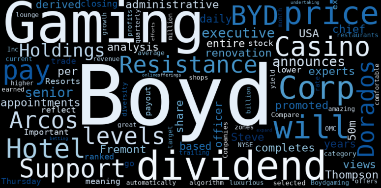 Are looking for the most relevant information about Boyd Gaming? Investor spend a lot of time searching for information to make investment decisions in Boyd Gaming. This task is often burdensome and consumes huge amounts of free time. It also leads to mistakes due to fatigue and bounded rationality. As a solution, we programmed an artificial intelligence that reads the whole internet and the uses natural language processing and vectorizers to summarize the information. Usually, the AI reads several hundred pages and summarize it to a short document. This document presents our results. We found that the most common words in the internet about Boyd Gaming are: Boyd, Gaming, dividend, price, Corp, pay, BYD, and the most common words in the summary are: game, boyd, stock, dividend, share, usa, news, . One of the sentences in the summary was: The average price target for Boyd Gaming is $76.27, which is …