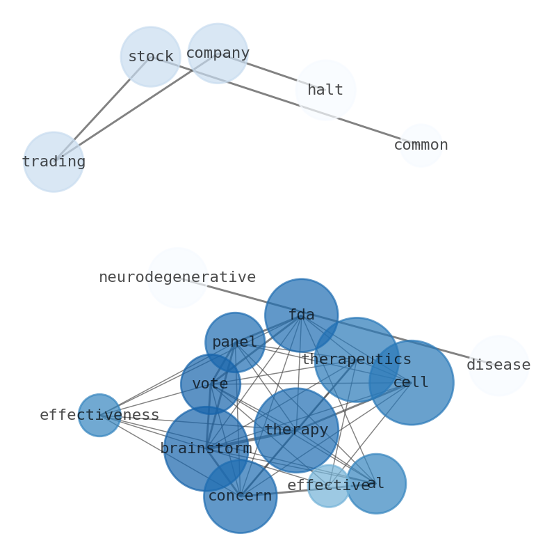 This document will help you to evaluate Brainstorm Cell Therapeutics without reading an infinite amount of sources. Relying only on stock quotes or prices to make investment decisions is a mistake. Analyzing and observing stock charts, highs and lows and other numerical data does not allow to evaluate the real value of a company. Stock quotes and prices are the result of underlying characteristics of a company and of events and news happening around them. For this reason, investing must be based on information, not numbers. As a solution, we programmed an artificial intelligence that reads the whole internet and the uses natural language processing and vectorizers to summarize the information. Usually, the AI reads several hundred pages and summarize it to a short document. This document presents our results. We found that the most common words in the internet about Brainstorm Cell Therapeutics are: therapy, FDA, concern, Cell, Therapeutics, …