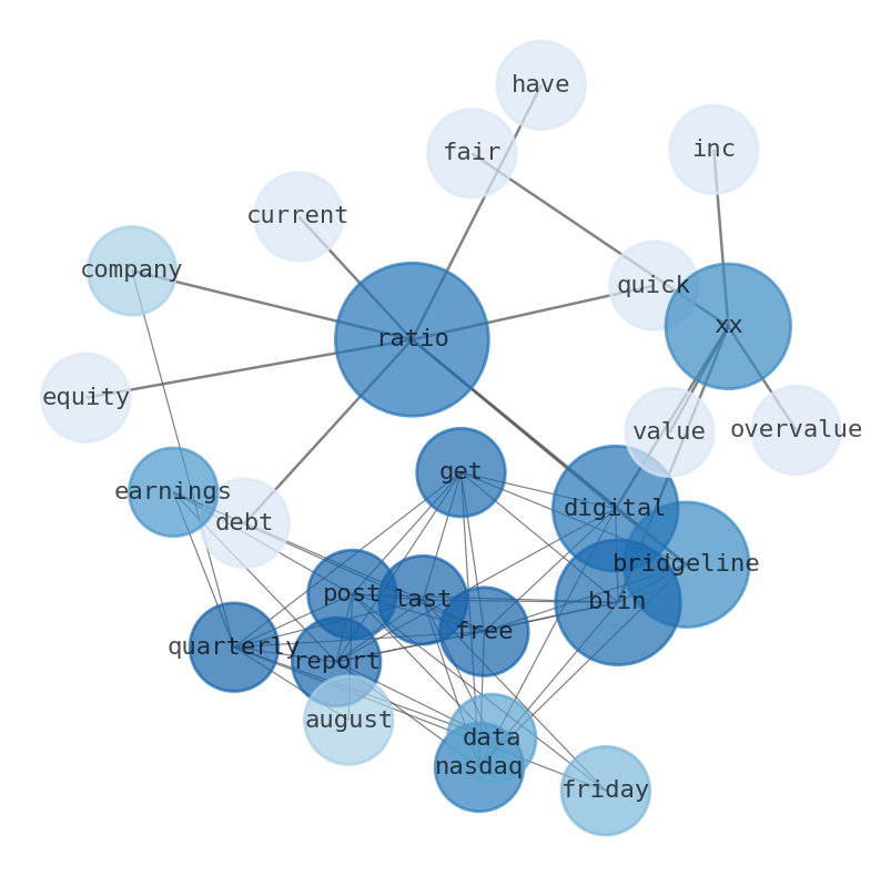The game is changing. There is a new strategy to evaluate Bridgeline Digital fundamental value, possible risks and most salient advantages. Investors have traditionally relied in reading large amounts of text to evaluate the fundamental value of a stock or company. However, the development of Artificial Intelligence (AI) tools is modifying the way investments are evaluated in markets. Today, machine learning, natural language processing and bigdata allow making this process automatic, reducing large amounts of text to the elements that have a higher activation in a neural network. We programmed an artificial intelligence that reads the whole internet and the uses natural language processing and vectorizers to summarize the information. Usually, the AI reads several hundred pages and summarize it to a short document. This document presents our results. We found that the most common words in the internet about Bridgeline Digital are: ratio, Bridgeline, Digital, NASDAQBLIN, Get, Free, Report, and the most common words in the summary are: digital, bridgeline, software, market, inc, search, best, . One of the sentences in the summary was: Bridgeline Digital ( NASDAQ:BLIN – Get Free Report ) last posted its quarterly earnings data on Friday, August 11th. Other searches related to this term that the AI found were: stockmarketlive, livestock, stockmarketforbeginners, thestockmarket, stockmarkettoday, stockmarkettrading, stockmarketstocks, todaystockmarket, thestockmarket, marketnews, stockmarketnews, whatisstockmarket, usstockmarket, stockmarketopen. #digital #bridgeline #software #market #inc #search #best.