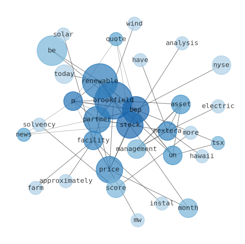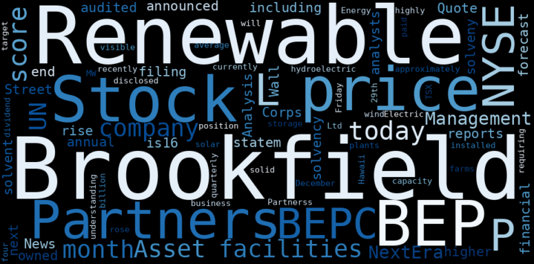 Are looking for the most relevant information about Brookfield Renewable? Investor spend a lot of time searching for information to make investment decisions in Brookfield Renewable. This task is often burdensome and consumes huge amounts of free time. It also leads to mistakes due to fatigue and bounded rationality. As a solution, we programmed an artificial intelligence that reads the whole internet and the uses natural language processing and vectorizers to summarize the information. Usually, the AI reads several hundred pages and summarize it to a short document. This document presents our results. We found that the most common words in the internet about Brookfield Renewable are: Brookfield, Renewable, Partners, price, LP, BEP, Stock, and the most common words in the summary are: brookfield, renewable, stock, partner, energy, dividend, market, . One of the sentences in the summary was: Wall Street analysts forecast BEPC stock price to rise over the …