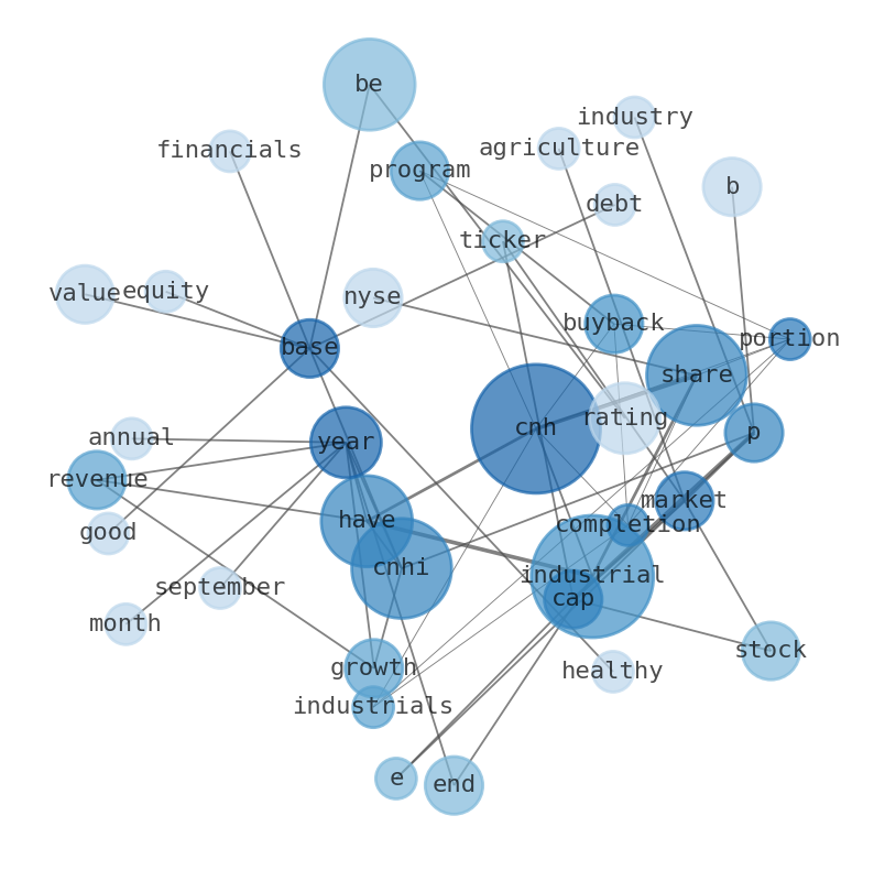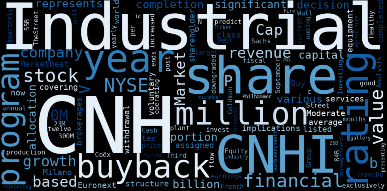 This document will help you to evaluate CNH Industrial without reading an infinite amount of sources. Relying only on stock quotes or prices to make investment decisions is a mistake. Analyzing and observing stock charts, highs and lows and other numerical data does not allow to evaluate the real value of a company. Stock quotes and prices are the result of underlying characteristics of a company and of events and news happening around them. For this reason, investing must be based on information, not numbers. As a solution, we programmed an artificial intelligence that reads the whole internet and the uses natural language processing and vectorizers to summarize the information. Usually, the AI reads several hundred pages and summarize it to a short document. This document presents our results. We found that the most common words in the internet about CNH Industrial are: CNH, Industrial, share, CNHI, company, value, rating, …