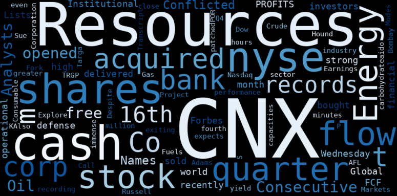 How much time have you spent trying to decide whether investing in CNX Resources? Many investors start with the dream of being free. They expect to find on the stock market an option to have time to develop their own interests and hobbies. That is, a way to escape a 9 to 5 job. However, investment is complex and investors end up spending whole days (and nights) trying to figure out which the right stock to invest is. The dream of stock investing becomes the nightmare of facing infinity amounts of information. As a solution, we programmed an artificial intelligence that reads the whole internet and the uses natural language processing and vectorizers to summarize the information. Usually, the AI reads several hundred pages and summarize it to a short document. This document presents our results. We found that the most common words in the internet about CNX Resources are: …