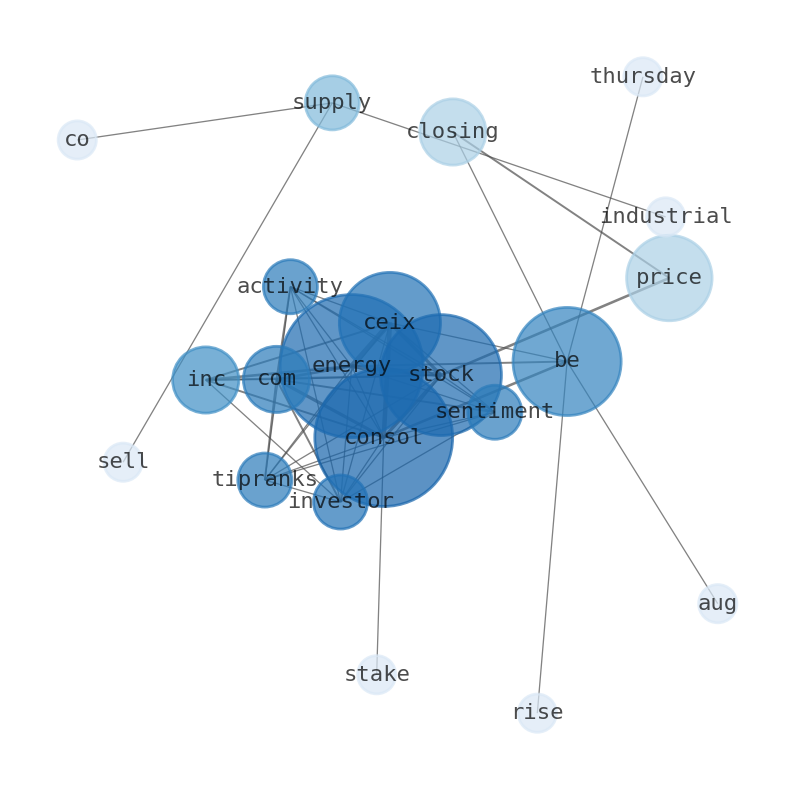 The game is changing. There is a new strategy to evaluate CONSOL Energy fundamental value, possible risks and most salient advantages. Investors have traditionally relied in reading large amounts of text to evaluate the fundamental value of a stock or company. However, the development of Artificial Intelligence (AI) tools is modifying the way investments are evaluated in markets. Today, machine learning, natural language processing and bigdata allow making this process automatic, reducing large amounts of text to the elements that have a higher activation in a neural network. We programmed an artificial intelligence that reads the whole internet and the uses natural language processing and vectorizers to summarize the information. Usually, the AI reads several hundred pages and summarize it to a short document. This document presents our results. We found that the most common words in the internet about CONSOL Energy are: Energy, Consol, stock, CEIX, price, energy, closing, and the most common words in the summary are: stock, energy, consol, ceix, change, market, price, . One of the sentences in the summary was: Consol Energy Inc (CEIX) stock is trading at $8491 as of 10:59 AM on Thursday, Aug 17, a rise $1.07% from the previous closing price of $83.19. Other searches related to this term that the AI found were: stockmarketlive, livestock, stockmarketforbeginners, thestockmarket, stockmarkettoday, stockmarkettrading, stockmarketstocks, todaystockmarket, thestockmarket, marketnews, stockmarketnews, whatisstockmarket, usstockmarket, stockmarketopen. #stock #energy #consol #ceix #change #market #price.
