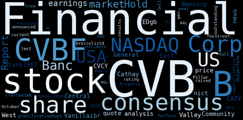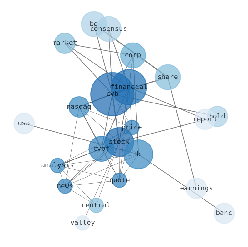 This document will help you to evaluate CVB Financial without reading an infinite amount of sources. Relying only on stock quotes or prices to make investment decisions is a mistake. Analyzing and observing stock charts, highs and lows and other numerical data does not allow to evaluate the real value of a company. Stock quotes and prices are the result of underlying characteristics of a company and of events and news happening around them. For this reason, investing must be based on information, not numbers. As a solution, we programmed an artificial intelligence that reads the whole internet and the uses natural language processing and vectorizers to summarize the information. Usually, the AI reads several hundred pages and summarize it to a short document. This document presents our results. We found that the most common words in the internet about CVB Financial are: CVB, Financial, stock, B, share, consensus, NASDAQCVBF, …