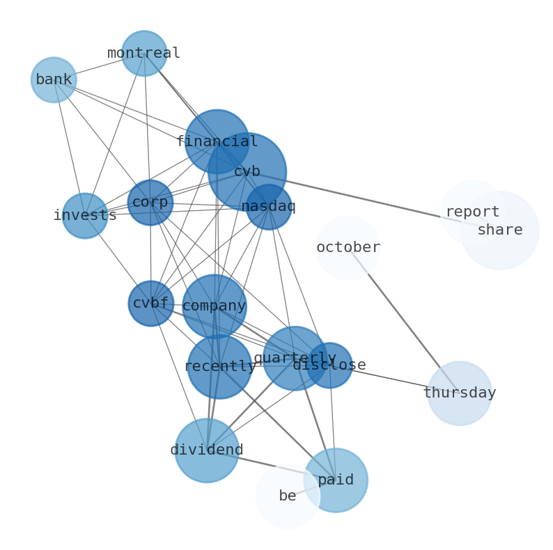 This document will help you to evaluate CVB Financial without reading an infinite amount of sources. Relying only on stock quotes or prices to make investment decisions is a mistake. Analyzing and observing stock charts, highs and lows and other numerical data does not allow to evaluate the real value of a company. Stock quotes and prices are the result of underlying characteristics of a company and of events and news happening around them. For this reason, investing must be based on information, not numbers. As a solution, we programmed an artificial intelligence that reads the whole internet and the uses natural language processing and vectorizers to summarize the information. Usually, the AI reads several hundred pages and summarize it to a short document. This document presents our results. We found that the most common words in the internet about CVB Financial are: CVB, share, Financial, company, recently, quarterly, dividend, …