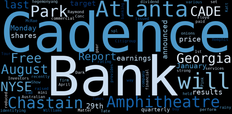 How much time have you spent trying to decide whether investing in Cadence Bank? Many investors start with the dream of being free. They expect to find on the stock market an option to have time to develop their own interests and hobbies. That is, a way to escape a 9 to 5 job. However, investment is complex and investors end up spending whole days (and nights) trying to figure out which the right stock to invest is. The dream of stock investing becomes the nightmare of facing infinity amounts of information. As a solution, we programmed an artificial intelligence that reads the whole internet and the uses natural language processing and vectorizers to summarize the information. Usually, the AI reads several hundred pages and summarize it to a short document. This document presents our results. We found that the most common words in the internet about Cadence Bank are: …