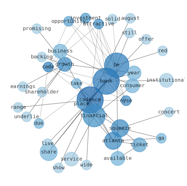 This document will help you to evaluate Cadence Bank without reading an infinite amount of sources. Relying only on stock quotes or prices to make investment decisions is a mistake. Analyzing and observing stock charts, highs and lows and other numerical data does not allow to evaluate the real value of a company. Stock quotes and prices are the result of underlying characteristics of a company and of events and news happening around them. For this reason, investing must be based on information, not numbers. As a solution, we programmed an artificial intelligence that reads the whole internet and the uses natural language processing and vectorizers to summarize the information. Usually, the AI reads several hundred pages and summarize it to a short document. This document presents our results. We found that the most common words in the internet about Cadence Bank are: Cadence, Bank, financial, share, Atlanta, bank, institutional, …