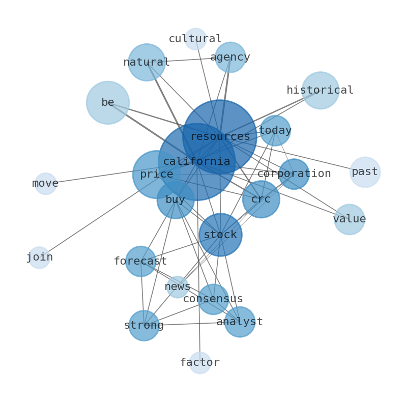 The game is changing. There is a new strategy to evaluate California Resources fundamental value, possible risks and most salient advantages. Investors have traditionally relied in reading large amounts of text to evaluate the fundamental value of a stock or company. However, the development of Artificial Intelligence (AI) tools is modifying the way investments are evaluated in markets. Today, machine learning, natural language processing and bigdata allow making this process automatic, reducing large amounts of text to the elements that have a higher activation in a neural network. We programmed an artificial intelligence that reads the whole internet and the uses natural language processing and vectorizers to summarize the information. Usually, the AI reads several hundred pages and summarize it to a short document. This document presents our results. We found that the most common words in the internet about California Resources are: California, Resources, price, CRC, historical, Corporation, stock, …