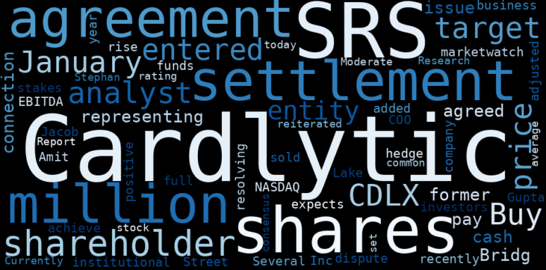 The game is changing. There is a new strategy to evaluate Cardlytics fundamental value, possible risks and most salient advantages. Investors have traditionally relied in reading large amounts of text to evaluate the fundamental value of a stock or company. However, the development of Artificial Intelligence (AI) tools is modifying the way investments are evaluated in markets. Today, machine learning, natural language processing and bigdata allow making this process automatic, reducing large amounts of text to the elements that have a higher activation in a neural network. We programmed an artificial intelligence that reads the whole internet and the uses natural language processing and vectorizers to summarize the information. Usually, the AI reads several hundred pages and summarize it to a short document. This document presents our results. We found that the most common words in the internet about Cardlytics are: SRS, Cardlytics, share, settlement, agreement, shareholder, CDLX, and the …