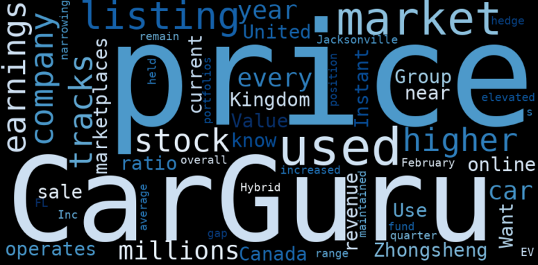 The game is changing. There is a new strategy to evaluate Cargurus fundamental value, possible risks and most salient advantages. Investors have traditionally relied in reading large amounts of text to evaluate the fundamental value of a stock or company. However, the development of Artificial Intelligence (AI) tools is modifying the way investments are evaluated in markets. Today, machine learning, natural language processing and bigdata allow making this process automatic, reducing large amounts of text to the elements that have a higher activation in a neural network. We programmed an artificial intelligence that reads the whole internet and the uses natural language processing and vectorizers to summarize the information. Usually, the AI reads several hundred pages and summarize it to a short document. This document presents our results. We found that the most common words in the internet about Cargurus are: price, CarGurus, use, listing, high, CarGuru, stock, and the …