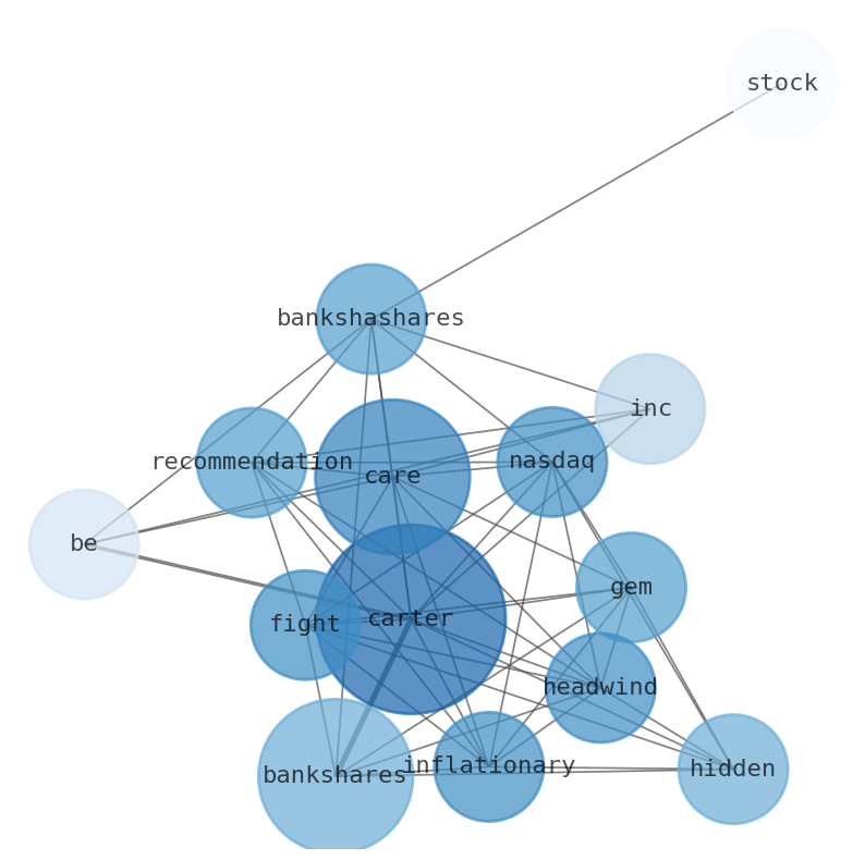 This document will help you to evaluate Carter Bankshares without reading an infinite amount of sources. Relying only on stock quotes or prices to make investment decisions is a mistake. Analyzing and observing stock charts, highs and lows and other numerical data does not allow to evaluate the real value of a company. Stock quotes and prices are the result of underlying characteristics of a company and of events and news happening around them. For this reason, investing must be based on information, not numbers. As a solution, we programmed an artificial intelligence that reads the whole internet and the uses natural language processing and vectorizers to summarize the information. Usually, the AI reads several hundred pages and summarize it to a short document. This document presents our results. We found that the most common words in the internet about Carter Bankshares are: Carter, Bankshares, A, Hidden, Gem, Fight, Inflationary, …