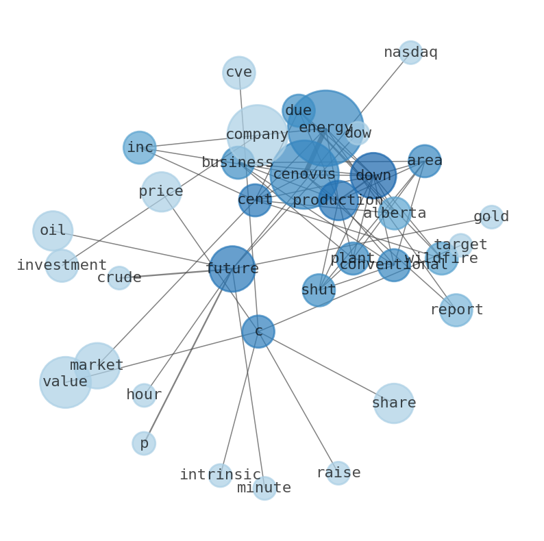 This document will help you to evaluate Cenovus Energy without reading an infinite amount of sources. Relying only on stock quotes or prices to make investment decisions is a mistake. Analyzing and observing stock charts, highs and lows and other numerical data does not allow to evaluate the real value of a company. Stock quotes and prices are the result of underlying characteristics of a company and of events and news happening around them. For this reason, investing must be based on information, not numbers. As a solution, we programmed an artificial intelligence that reads the whole internet and the uses natural language processing and vectorizers to summarize the information. Usually, the AI reads several hundred pages and summarize it to a short document. This document presents our results. We found that the most common words in the internet about Cenovus Energy are: Energy, Cenovus, company, value, shut, production, Futures, …
