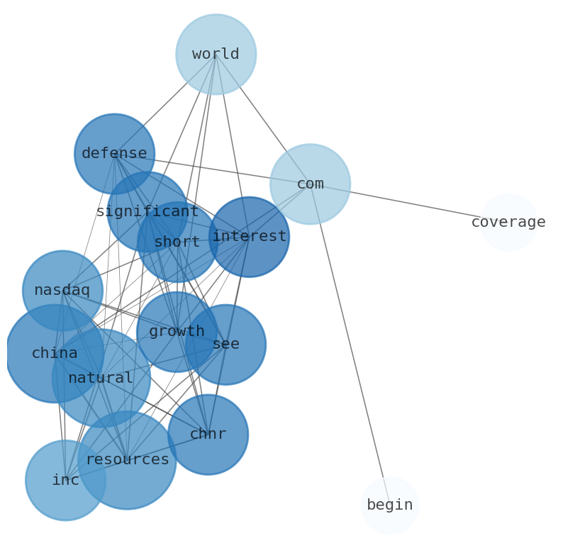 This document will help you to evaluate China Natural Resources without reading an infinite amount of sources. Relying only on stock quotes or prices to make investment decisions is a mistake. Analyzing and observing stock charts, highs and lows and other numerical data does not allow to evaluate the real value of a company. Stock quotes and prices are the result of underlying characteristics of a company and of events and news happening around them. For this reason, investing must be based on information, not numbers. As a solution, we programmed an artificial intelligence that reads the whole internet and the uses natural language processing and vectorizers to summarize the information. Usually, the AI reads several hundred pages and summarize it to a short document. This document presents our results. We found that the most common words in the internet about China Natural Resources are: China, Natural, Resources, significant, growth, …