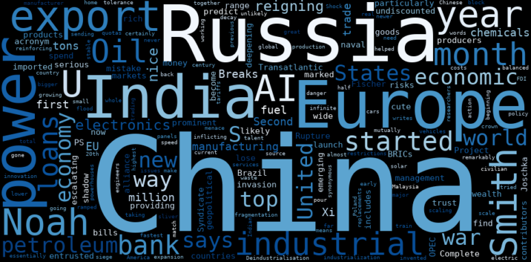 The Transatlantic Rupture Is Complete by Joschka Fischer - Project Syndicate. China has more to lose than we do on that mistake than we spend money on imported goods from China. China has a particularly wide range of shadow banks providing wealth management products, trust loans, entrusted loans, and undiscounted bank bills. The BRICs, which started out as a cute acronym for Brazil, Russia, India, and China as prominent emerging markets, have become an alliance that now includes some serious OPEC producers. There are some other countries rich in petroleum likely to find the U.S. Then China would launch a naval invasion. PS contributors predict a year marked by escalating geopolitical risks and deepening economic fragmentation. The United States and China are inflicting global economic costs – in mutually reinforcing ways. China has invented a whole new way to do innovation, Noah Smith says. The danger of a further expansion of great-power war is certainly there, he says. Noah Smith: Europe is under siege from Russia, China, and the United States all at once. Russia and China together are the real menace to Europe. China is a far bigger manufacturer than Europe, and can pour essentially infinite war production into Russia. China is the source of almost half of the top AI talent in the world. Only a small sliver of the Chinese top AI researchers working in America has gone back to their home. Since 2015, India has been the worlds fastest-growing major economy, taking the crown from China. FDI helped make China, Poland, and Malaysia into export powerhouses. The reigning industrial powers of the 20th century were remarkably nice to China during its early industrialization. But China, the current reigning industrial power, is unlikely to be so nice to India. As Indian electronics manufacturing has ramped up, China has tried to block its engineers from going to India to train their replacements. Europe is not trading services for the flood of electric cars, solar panels, and so on that China is sending. Deindustrialisation, in other words, need not be synonymous with decay. It means scaling up civilian manufacturing of vehicles, electronics, chemicals, chemicals. EU tariffs and other trade restrictions should only be on China, not on any other country, writes Noah Smith. Europe can never match the scale, speed, and tolerance for waste of Chinas industrial policy. EU action against the Second China Shock could be the beginning of a newer, more stable, more balanced economy. China issues first 2026 fuel export quotas for the new year, at a total of 19 million tons. Chinas 2025 fuel exports were lower on the previous year at 52.65 million tons over the first 11 months of 2025. China exports second-highest monthly volume of rare earth magnets ever in November. US-bound deliveries were down 11% month-on-month as Beijing continues to restrict sales despite a Trump-Xi trade truce. The Indonesian government has launched its Petroleum Bidding Round (IPBR) 3. Washington treating AI supremacy as a matter of wartime urgency. Under Xi Jinpings oversight, China started to create an integrated ecosystem where nearly every technological advance can serve military. U.S. Coast Guard intercepted two Venezuelan crude tankers, and the blockade has successfully disrupted oil flows between Venezuela, Cuba, and China. Russia Faces Sharp Drop in Oil Tax Revenue at Start of 2026. Brent Breaks below $60 on Oversupply Fears Chinas Oil Pumping Power Breaks All Records. ExxonMobil Pauses Offshore Wind Leases over National Security concerns.