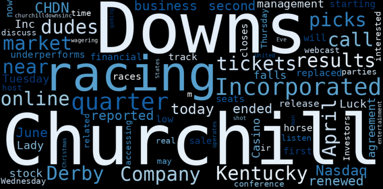 Are looking for the most relevant information about Churchill Downs? Investor spend a lot of time searching for information to make investment decisions in Churchill Downs. This task is often burdensome and consumes huge amounts of free time. It also leads to mistakes due to fatigue and bounded rationality. As a solution, we programmed an artificial intelligence that reads the whole internet and the uses natural language processing and vectorizers to summarize the information. Usually, the AI reads several hundred pages and summarize it to a short document. This document presents our results. We found that the most common words in the internet about Churchill Downs are: Churchill, Downs, race, Incorporated, quarter, pick, result, and the most common words in the summary are: down, churchill, kentucky, derby, news, incorporate, race, . One of the sentences in the summary was: Kentucky Derby 2023 tickets for the horse races at Churchill Downs …