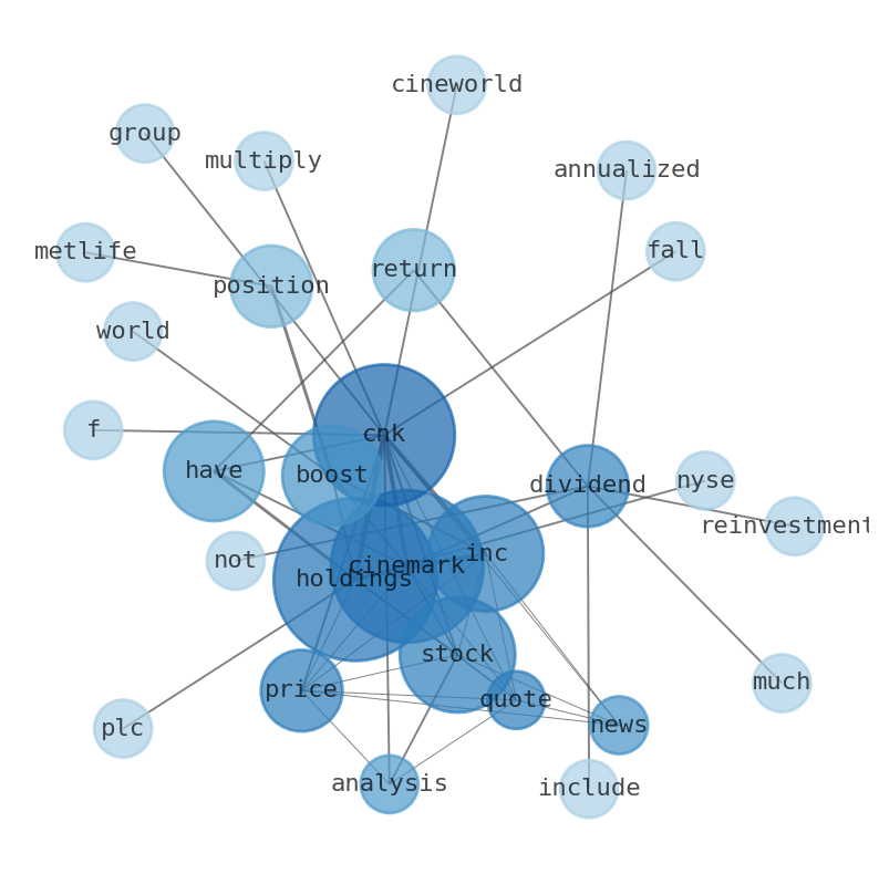 This document will help you to evaluate Cinemark Holdings without reading an infinite amount of sources. Relying only on stock quotes or prices to make investment decisions is a mistake. Analyzing and observing stock charts, highs and lows and other numerical data does not allow to evaluate the real value of a company. Stock quotes and prices are the result of underlying characteristics of a company and of events and news happening around them. For this reason, investing must be based on information, not numbers. As a solution, we programmed an artificial intelligence that reads the whole internet and the uses natural language processing and vectorizers to summarize the information. Usually, the AI reads several hundred pages and summarize it to a short document. This document presents our results. We found that the most common words in the internet about Cinemark Holdings are: Cinemark, stock, holding, Holdings, CNK, boost, Inc, …