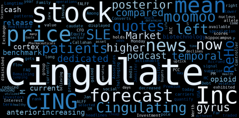 This document will help you to evaluate Cingulate without reading an infinite amount of sources. Relying only on stock quotes or prices to make investment decisions is a mistake. Analyzing and observing stock charts, highs and lows and other numerical data does not allow to evaluate the real value of a company. Stock quotes and prices are the result of underlying characteristics of a company and of events and news happening around them. For this reason, investing must be based on information, not numbers. As a solution, we programmed an artificial intelligence that reads the whole internet and the uses natural language processing and vectorizers to summarize the information. Usually, the AI reads several hundred pages and summarize it to a short document. This document presents our results. We found that the most common words in the internet about Cingulate are: Cingulate, Cingulates, stock, Inc, mean, price, CING, and the most common words in the summary are: cingulate, stock, inc, price, bloomberg, cingulates, market, . One of the sentences in the summary was: stock forecast for 1 year from now: $ 8.91 (180.09%) Cingulates Inc. Other searches related to this term that the AI found were: stockmarketlive, livestock, stockmarketforbeginners, thestockmarket, stockmarkettoday, stockmarkettrading, stockmarketstocks, todaystockmarket, thestockmarket, marketnews, stockmarketnews, whatisstockmarket, usstockmarket, stockmarketopen. #cingulate #stock #inc #price #bloomberg #cingulates #market.