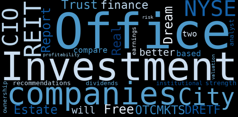 How much time have you spent trying to decide whether investing in City Office REIT? Many investors start with the dream of being free. They expect to find on the stock market an option to have time to develop their own interests and hobbies. That is, a way to escape a 9 to 5 job. However, investment is complex and investors end up spending whole days (and nights) trying to figure out which the right stock to invest is. The dream of stock investing becomes the nightmare of facing infinity amounts of information. As a solution, we programmed an artificial intelligence that reads the whole internet and the uses natural language processing and vectorizers to summarize the information. Usually, the AI reads several hundred pages and summarize it to a short document. This document presents our results. We found that the most common words in the internet about City Office REIT are: Office, company, City, REIT, NYSECIO, Get, Free, and the most common words in the summary are: office, reit, news, real, estate, etf, dividend, . One of the sentences in the summary was: City Office REIT ( NYSE:CIO – Get Free Report ) and Dream Office Real Estate Investment Trust ( OTCMKTS:DRETF) are both finance companies, but which is the better investment? We will compare the two companies based on the strength of their analyst recommendations, institutional ownership, earnings, dividends, profitability, risk and valuation.. Other searches related to this term that the AI found were: stockmarketlive, livestock, stockmarketforbeginners, thestockmarket, stockmarkettoday, stockmarkettrading, stockmarketstocks, todaystockmarket, thestockmarket, marketnews, stockmarketnews, whatisstockmarket, usstockmarket, stockmarketopen. #office #reit #news #real #estate #etf #dividend.