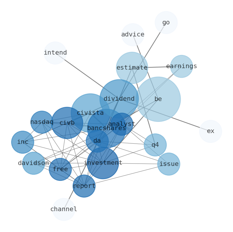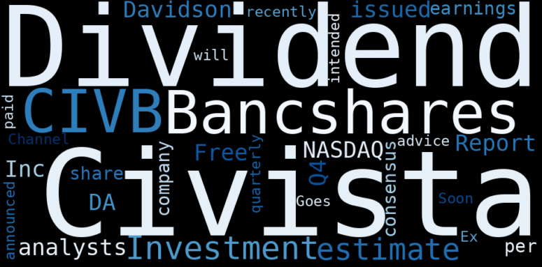 Are looking for the most relevant information about Civista Bancshares? Investor spend a lot of time searching for information to make investment decisions in Civista Bancshares. This task is often burdensome and consumes huge amounts of free time. It also leads to mistakes due to fatigue and bounded rationality. As a solution, we programmed an artificial intelligence that reads the whole internet and the uses natural language processing and vectorizers to summarize the information. Usually, the AI reads several hundred pages and summarize it to a short document. This document presents our results. We found that the most common words in the internet about Civista Bancshares are: Civista, Bancshares, estimate, Inc, NASDAQCIVB, Free, Report, and the most common words in the summary are: bancshares, bank, civista, inc, job, admin, credit, . One of the sentences in the summary was: Civista Bancshares (CIVB) Goes Ex-Dividend Soon. Other searches related to this …