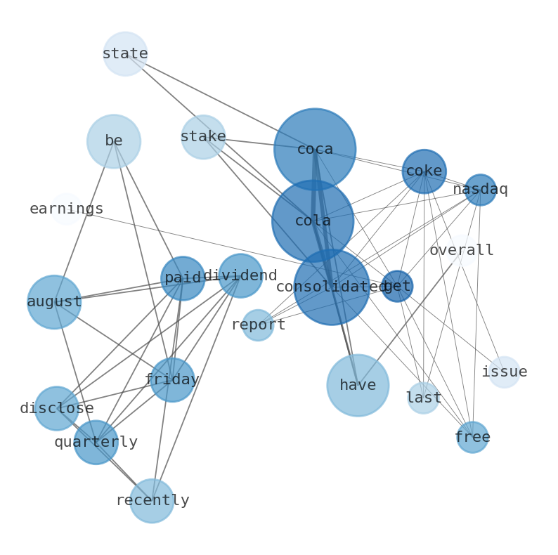 This document will help you to evaluate Coca-Cola Consolidated without reading an infinite amount of sources. Relying only on stock quotes or prices to make investment decisions is a mistake. Analyzing and observing stock charts, highs and lows and other numerical data does not allow to evaluate the real value of a company. Stock quotes and prices are the result of underlying characteristics of a company and of events and news happening around them. For this reason, investing must be based on information, not numbers. As a solution, we programmed an artificial intelligence that reads the whole internet and the uses natural language processing and vectorizers to summarize the information. Usually, the AI reads several hundred pages and summarize it to a short document. This document presents our results. We found that the most common words in the internet about Coca-Cola Consolidated are: CocaCola, Consolidated, August, company, recently, disclose, quarterly, …