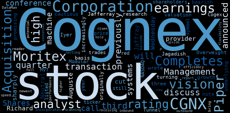 This document will help you to evaluate Cognex without reading an infinite amount of sources. Relying only on stock quotes or prices to make investment decisions is a mistake. Analyzing and observing stock charts, highs and lows and other numerical data does not allow to evaluate the real value of a company. Stock quotes and prices are the result of underlying characteristics of a company and of events and news happening around them. For this reason, investing must be based on information, not numbers. As a solution, we programmed an artificial intelligence that reads the whole internet and the uses natural language processing and vectorizers to summarize the information. Usually, the AI reads several hundred pages and summarize it to a short document. This document presents our results. We found that the most common words in the internet about Cognex are: Cognex, stock, Corporation, CGNX, Completes, Moritex, earnings, and the …