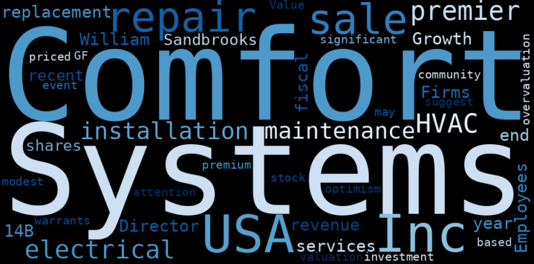 The game is changing. There is a new strategy to evaluate Comfort Systems USA fundamental value, possible risks and most salient advantages. Investors have traditionally relied in reading large amounts of text to evaluate the fundamental value of a stock or company. However, the development of Artificial Intelligence (AI) tools is modifying the way investments are evaluated in markets. Today, machine learning, natural language processing and bigdata allow making this process automatic, reducing large amounts of text to the elements that have a higher activation in a neural network. We programmed an artificial intelligence that reads the whole internet and the uses natural language processing and vectorizers to summarize the information. Usually, the AI reads several hundred pages and summarize it to a short document. This document presents our results. We found that the most common words in the internet about Comfort Systems USA are: Comfort, Systems, USA, Inc, repair, …