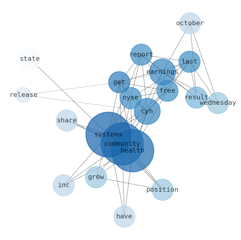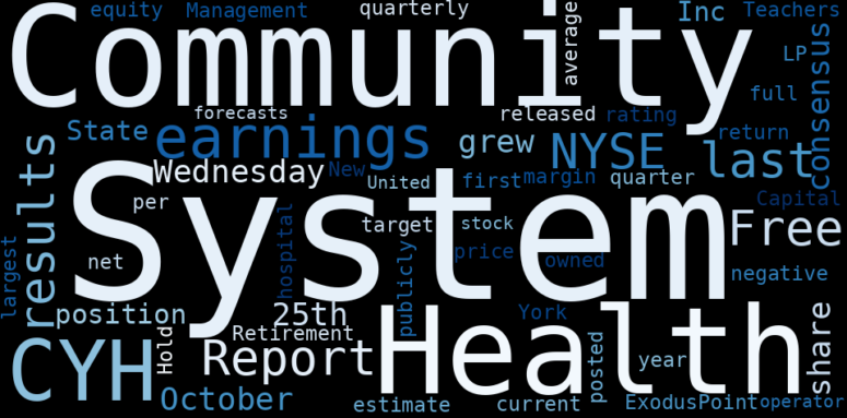 Are looking for the most relevant information about Community Health Systems? Investor spend a lot of time searching for information to make investment decisions in Community Health Systems. This task is often burdensome and consumes huge amounts of free time. It also leads to mistakes due to fatigue and bounded rationality. As a solution, we programmed an artificial intelligence that reads the whole internet and the uses natural language processing and vectorizers to summarize the information. Usually, the AI reads several hundred pages and summarize it to a short document. This document presents our results. We found that the most common words in the internet about Community Health Systems are: Community, Health, Systems, earnings, system, NYSECYH, Get, and the most common words in the summary are: health, care, community, system, center, service, hospital, . One of the sentences in the summary was: Community Health systems ( NYSE:CYH – Get Free …