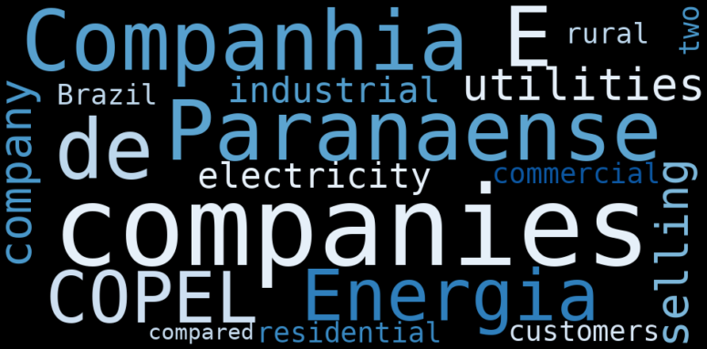 This document will help you to evaluate Companhia Paranaense de Energia without reading an infinite amount of sources. Relying only on stock quotes or prices to make investment decisions is a mistake. Analyzing and observing stock charts, highs and lows and other numerical data does not allow to evaluate the real value of a company. Stock quotes and prices are the result of underlying characteristics of a company and of events and news happening around them. For this reason, investing must be based on information, not numbers. As a solution, we programmed an artificial intelligence that reads the whole internet and the uses natural language processing and vectorizers to summarize the information. Usually, the AI reads several hundred pages and summarize it to a short document. This document presents our results. We found that the most common words in the internet about Companhia Paranaense de Energia are: company, EOn, Companhia, …