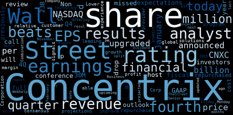 How much time have you spent trying to decide whether investing in Concentrix? Many investors start with the dream of being free. They expect to find on the stock market an option to have time to develop their own interests and hobbies. That is, a way to escape a 9 to 5 job. However, investment is complex and investors end up spending whole days (and nights) trying to figure out which the right stock to invest is. The dream of stock investing becomes the nightmare of facing infinity amounts of information. As a solution, we programmed an artificial intelligence that reads the whole internet and the uses natural language processing and vectorizers to summarize the information. Usually, the AI reads several hundred pages and summarize it to a short document. This document presents our results. We found that the most common words in the internet about Concentrix are: Concentrix, share, …