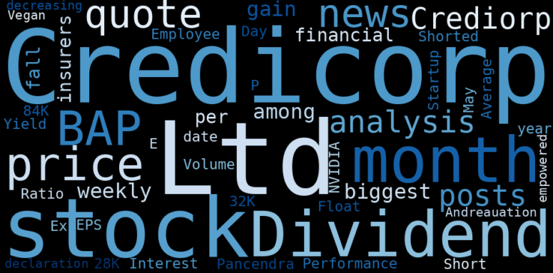 How much time have you spent trying to decide whether investing in Credicorp? Many investors start with the dream of being free. They expect to find on the stock market an option to have time to develop their own interests and hobbies. That is, a way to escape a 9 to 5 job. However, investment is complex and investors end up spending whole days (and nights) trying to figure out which the right stock to invest is. The dream of stock investing becomes the nightmare of facing infinity amounts of information. As a solution, we programmed an artificial intelligence that reads the whole internet and the uses natural language processing and vectorizers to summarize the information. Usually, the AI reads several hundred pages and summarize it to a short document. This document presents our results. We found that the most common words in the internet about Credicorp are: Credicorp, Ltd, …