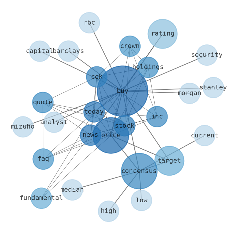 The game is changing. There is a new strategy to evaluate Crown Holdings fundamental value, possible risks and most salient advantages. Investors have traditionally relied in reading large amounts of text to evaluate the fundamental value of a stock or company. However, the development of Artificial Intelligence (AI) tools is modifying the way investments are evaluated in markets. Today, machine learning, natural language processing and bigdata allow making this process automatic, reducing large amounts of text to the elements that have a higher activation in a neural network. We programmed an artificial intelligence that reads the whole internet and the uses natural language processing and vectorizers to summarize the information. Usually, the AI reads several hundred pages and summarize it to a short document. This document presents our results. We found that the most common words in the internet about Crown Holdings are: Buy, Concensus, Price, Target, Crown, Holdings, Inc, and the most common words in the summary are: crown, triple, electrokinetics, price, stake, holding, race, . One of the sentences in the summary was: Price Target Current $83.70 Concensus $124.29 Concensus: Low $100.00 Median $122.00 High $165.00 Concensus Price Target $8384. Other searches related to this term that the AI found were: stockmarketlive, livestock, stockmarketforbeginners, thestockmarket, stockmarkettoday, stockmarkettrading, stockmarketstocks, todaystockmarket, thestockmarket, marketnews, stockmarketnews, whatisstockmarket, usstockmarket, stockmarketopen. #crown #triple #electrokinetics #price #stake #holding #race.