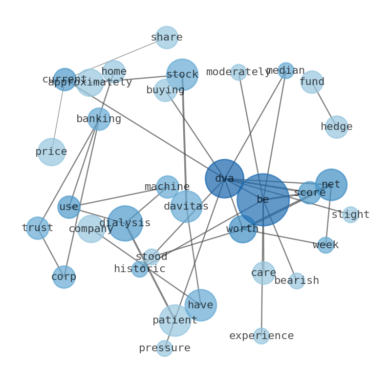 How much time have you spent trying to decide whether investing in DaVita? Many investors start with the dream of being free. They expect to find on the stock market an option to have time to develop their own interests and hobbies. That is, a way to escape a 9 to 5 job. However, investment is complex and investors end up spending whole days (and nights) trying to figure out which the right stock to invest is. The dream of stock investing becomes the nightmare of facing infinity amounts of information. As a solution, we programmed an artificial intelligence that reads the whole internet and the uses natural language processing and vectorizers to summarize the information. Usually, the AI reads several hundred pages and summarize it to a short document. This document presents our results. We found that the most common words in the internet about DaVita are: DaVita, DVA, …