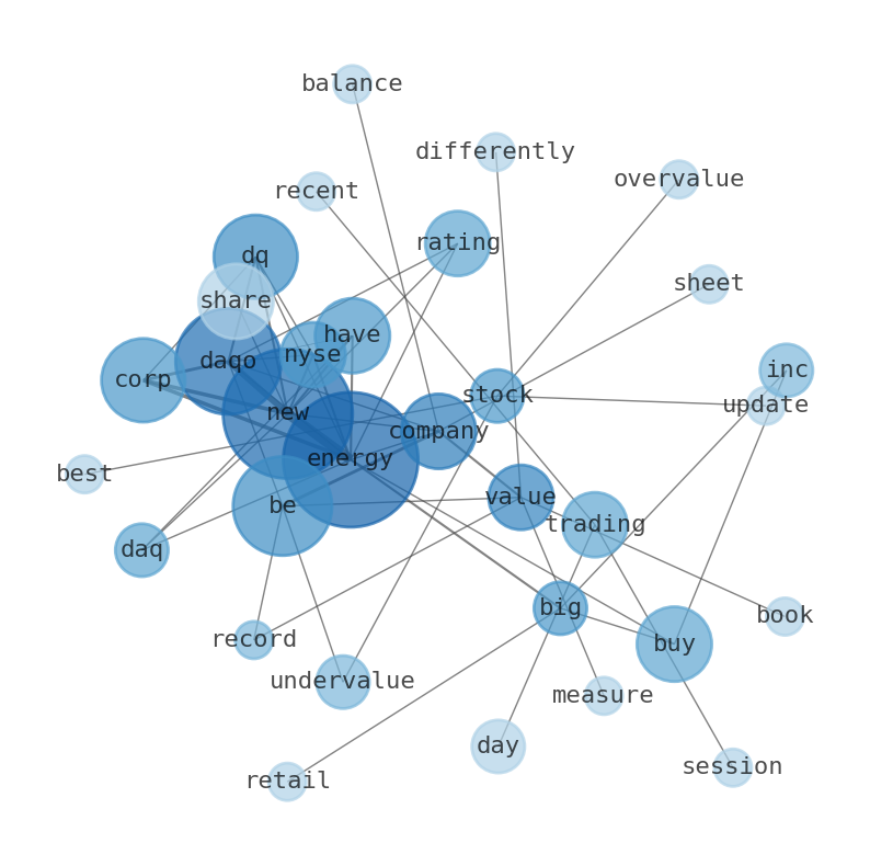 This document will help you to evaluate Daqo New Energy without reading an infinite amount of sources. Relying only on stock quotes or prices to make investment decisions is a mistake. Analyzing and observing stock charts, highs and lows and other numerical data does not allow to evaluate the real value of a company. Stock quotes and prices are the result of underlying characteristics of a company and of events and news happening around them. For this reason, investing must be based on information, not numbers. As a solution, we programmed an artificial intelligence that reads the whole internet and the uses natural language processing and vectorizers to summarize the information. Usually, the AI reads several hundred pages and summarize it to a short document. This document presents our results. We found that the most common words in the internet about Daqo New Energy are: New, Energy, Daqo, Corp, Buy, …