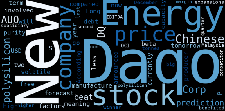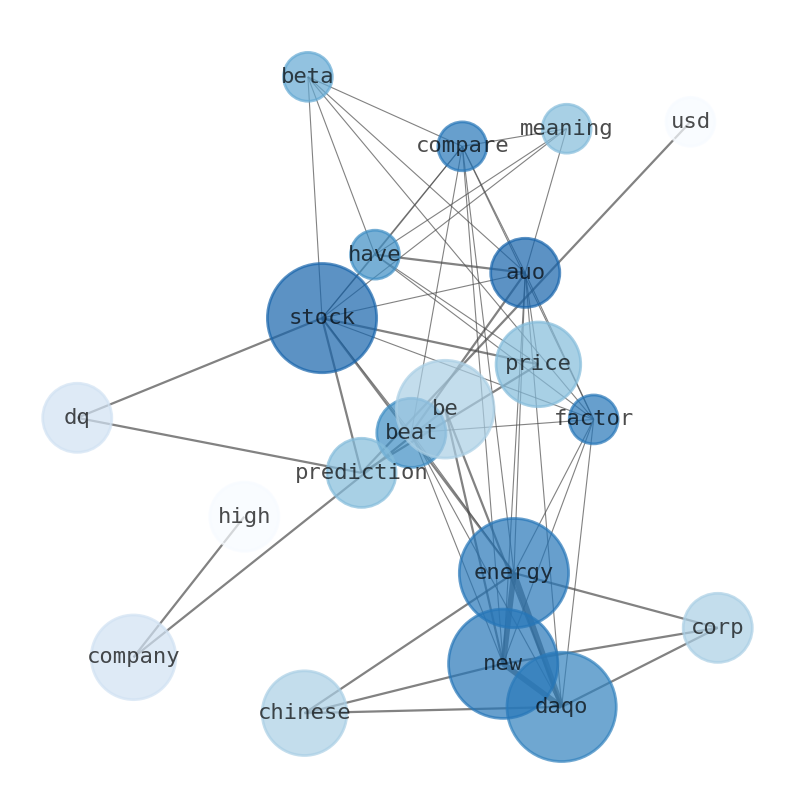 Are looking for the most relevant information about Daqo New Energy? Investor spend a lot of time searching for information to make investment decisions in Daqo New Energy. This task is often burdensome and consumes huge amounts of free time. It also leads to mistakes due to fatigue and bounded rationality. As a solution, we programmed an artificial intelligence that reads the whole internet and the uses natural language processing and vectorizers to summarize the information. Usually, the AI reads several hundred pages and summarize it to a short document. This document presents our results. We found that the most common words in the internet about Daqo New Energy are: New, Energy, stock, Daqo, price, company, beat, and the most common words in the summary are: energy, new, stock, solar, market, inc, news, . One of the sentences in the summary was: AUO has a beta of 0.54, meaning that …